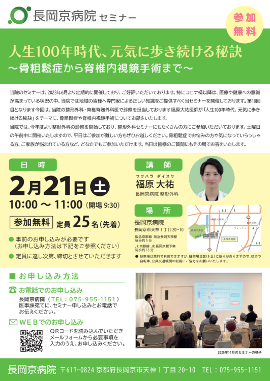 当院のセミナーは、2023年6月より定期的に開催しており、ご好評をいただいております。特にコロナ禍以降は、医療や健康への意識が高まっている状況の中、当院では地域の皆様へ専門家による正しい知識をご提供すべく当セミナーを開催しております。第18回目となります今回は、当院の整形外科・脊椎脊髄外科医で診察を担当しております福原大祐医師が「人生100年時代、元気に歩き続ける秘訣」をテーマに、骨粗鬆症や脊椎内視鏡手術についてお話をいたします。